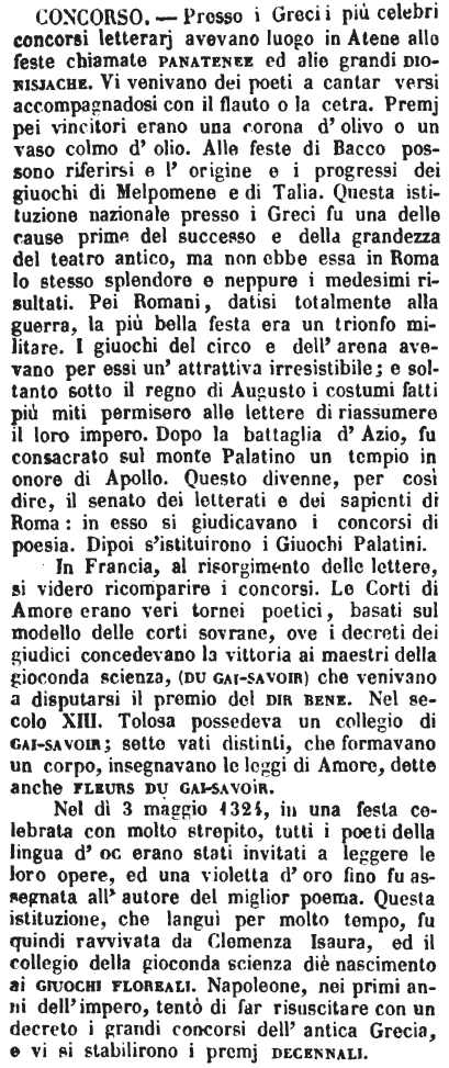 In Francia, al risorgimento delle lettere, si videro ricomparire i concorsi. Le Corti di Amore erano veri tornei poetici, basati sul modello delle corti sovrane, ove i decreti dei giudici concedevano la vittoria ai maestri della gioconda scienza, (du gai-savoir) che venivano a disputarsi il premio del dir bene. Nel secolo XIII. Tolosa possedeva un collegio di gai-savoir; sette vati distinti, che formavano un corpo, insegnavano le leggi di Amore, dette anche fleurs du gai-savoir. Nel dì 3 maggio 1324, in una festa celebrata con molto strepito, tutti i poeti della lingua d'oc erano stati invitati a leggere le loro opere, ed una violetta d'oro fino fu assegnata all'autore del miglior poema. Questa istituzione, che languì per molto tempo, fu quindi ravvivata da Clemenza Isaura, ed il collegio della gioconda scienza diè nascimento ai giuochi floreali. Napoleone, nei primi anni dell'impero, tentò di far risuscitare con un decreto i grandi concorsi dell'antica Grecia, e vi si stabilirono i premj decennali. [immagine] |