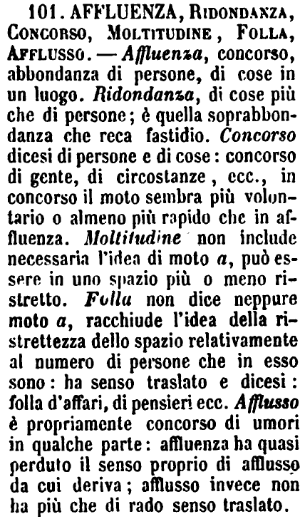 | Affluenza, Concorso, Moltitudine, Folla, Calca - Affluenza è delle persone e delle merci, ed è quando da una o più parti ne vengono tante a un tratto, che sembrano una fiumana. - «Il treno è ritardato per l'affluenza dei viaggiatori.» - Delle sole persone è il Concorso; ed è quando ne vengono molte in un dato luogo, da varii luoghi, ma spicciolatamente. - Moltitudine indica solo gran numero di persone considerate come unite insieme; mentre Folla significa molta gente raccolta in un luogo, dove sta a disagio; ma quando il disagio è molto, e l'una persona sta quasi pigiata addosso all'altra, allora si dice Calca. [immagine] |