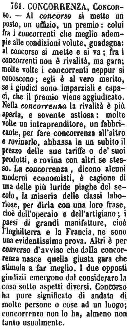 | Concorrenza, Concorso - Al concorso si mette un posto, un uffizio, un premio: colui fra i concorrenti che meglio adempie alle condizioni volute, guadagna: al concorso si mette e si va; fra i concorrenti non è rivalità, ma gara; molte volte i concorrenti neppur si conoscono; egli è al vero merito, se i giudici sono imparziali e capaci, che il premio viene aggiudicato. Nella concorrenza la rivalità è più aperta, e sovente astiosa: molte volte un intraprenditore, un fabbricante, per fare concorrenza all'altro e rovinarlo, abbassa in un subito il prezzo delle sue tariffe o de' suoi prodotti, e rovina con altri se stesso. La concorrenza, dicono alcuni moderni economisti, è cagione di una delle più luride piaghe del secolo, la miseria delle classi laboriose, per dirla con una loro frase, cioè dell'operaio e dell'artigiano; i paesi di grandi manifatture, cioè l'Inghilterra e la Francia, ne sono una evidentissima prova. Altri è per converso d'avviso che dalla concorrenza nasce quella giusta gara che stimola a far meglio. I due opposti giudizii emergono dal considerare la cosa sotto aspetti diversi. Concorso ha pure significato di andata di molte persone o cose ad un luogo; concorrenza non lo ha, almeno non tanto usualmente. [immagine] |