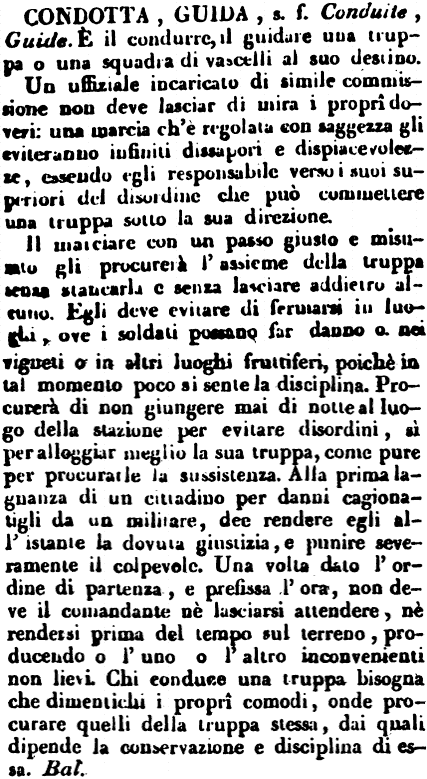 | Condotta, Guida - s. f. Conduite, Guide. È il condurre, il guidare una truppa o una squadra di vascelli al suo destino.