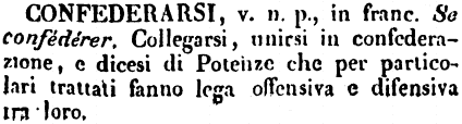 | Confederarsi - v. n. p., in franc. Se confédérer. Collegarsi, unirsi in confederazione, e dicesi di Potenze che per particolari trattati fanno lega offensiva e difensiva tra loro. [immagine] |