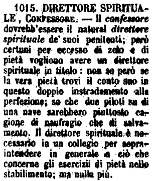 | Direttore spirituale, Confessore - Il confessore dovrebb'essere il natural direttore spirituale de' suoi penitenti; però certuni per eccesso di zelo e di pietà vogliono avere un direttore spirituale in titolo: non so però se la vera pietà trovi il conto suo in questo doppio instradamento alla perfezione; so che due piloti su di una nave sarebbero piuttosto cagione di naufragio che di salvamento. Il direttore spirituale è necessario in un collegio per sopraintendere in generale a ciò che concerne gli esercizii di pietà nello stabilimento; ma nulla più. [immagine] |