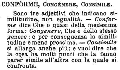 | Conforme, Congenere, Consimile - Son tre adjettivi che indicano similitudine, non egualità. - Conforme dice Che è quasi della medesima forma; Congenere, Che è dello stesso genere; e per conseguenza la similitudine è meno prossima. - Consimile si allarga anche più; e vuol dire che la cosa ha molti punti che la fanno parer simile all'altra con la quale si confronta. [immagine] |
