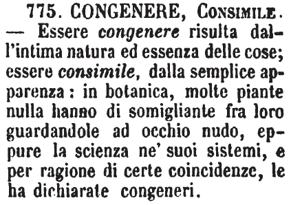 | Congenere, Consimile - Essere congenere risulta dall'intima natura ed essenza delle cose; essere consimile, dalla semplice apparenza: in botanica, molte piante nulla hanno di somigliante fra loro guardandole ad occhio nudo, eppure la scienza ne' suoi sistemi, e per ragione di certe coincidenze, la ha dichiarate congeneri. [immagine] |