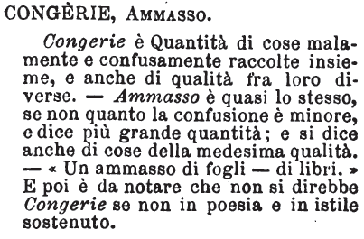 | Congerie, Ammasso - Congerie è Quantità di cose malamente e confusamente raccolte insieme, e anche di qualità fra loro diverse. - Ammasso è quasi lo stesso, se non quanto la confusione è minore, e dice più grande quantità; e si dice anche di cose della medesima qualità. - «Un ammasso di fogli - di libri.» E poi è da notare che non si direbbe Congerie se non in poesia e in istile sostenuto. [immagine] |