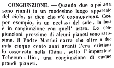| Congiunzione - Quando due o più astri sono riuniti in un medesimo luogo apparente del cielo, si dice che v'è congiunzione. Così, per esempio, in un ecclissi del sole, la luna è in congiunzione con quell'astro. Le congiunzioni prossime di alcuni pianeti sono rarissime. Il Padre Martini narra che oltre a due mila cinque cento anni avanti l'era cristiana fu osservata nella China, sotto l'imperatore Teheoun-Hio, una congiunzione di cinque grandi pianeti. [immagine] |