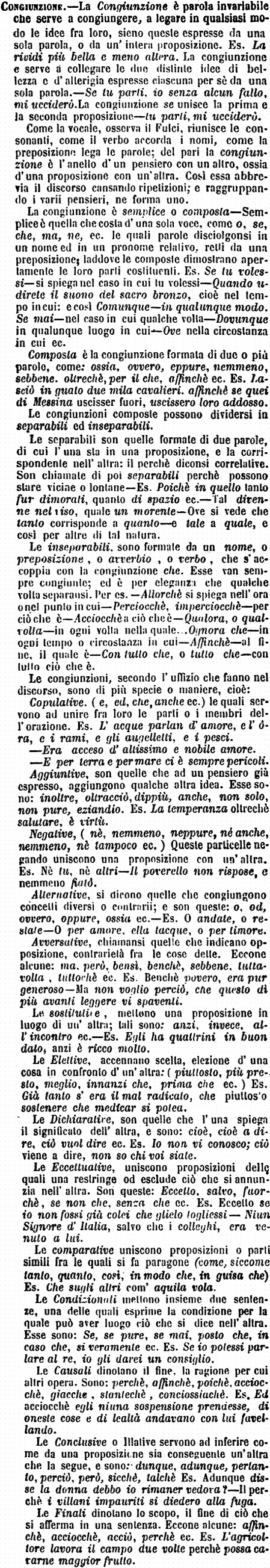 | Congiunzione - La Congiunzione è parola invariabile che serve a congiungere, a legare in qualsiasi modo le idee fra loro, sieno queste espresse da una sola parola, o da un'intera proposizione. Es. La rividi più bella e meno altera. La congiunzione e serve a collegare le due distinte idee di bellezza e d'alterigia espresse ciascuna per sè da una sola parola. - Se tu parti, io senza alcun fallo, mi ucciderò. La congiunzione se unisce la prima e la seconda proposizione - tu parti, mi ucciderò.
