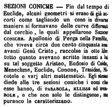 - Nel 1838, nel periodico Annali delle Scienze del Regno Lombardo Veneto, è riportato: "Tutte le superficie coniche passeranno per questo ed insieme per l'altro, ond'è ch'essendo inoltre piana la curva ed un solo il piano secante, la superficie dell'evolute (ridotte a soli punti) si stringerà nell'unica linea comune a tutte le superficie coniche".