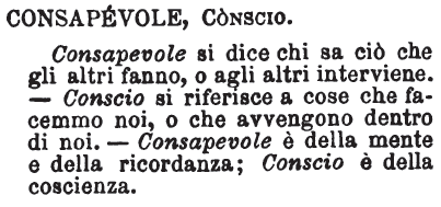 | Consapevole, Conscio - Consapevole si dice chi sa ciò che gli altri fanno, o agli altri interviene. - Conscio si riferisce a cose che facemmo noi, o che avvengono dentro di noi. - Consapevole è della mente e della ricordanza; Conscio è della coscienza. [immagine] |