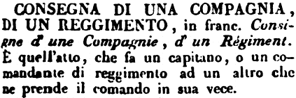 | Consegna di una compagnia, di un reggimento - in franc. Consigne d'une Compagnie, d'un Régiment. È quell'atto, che fa un capitano, o un comandante di reggimento ad un altro che ne prende il comando in sua vece. [immagine] |