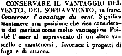 | Conservare il vantaggio del vento, del sopravvento - in franc. Conserver l'avantage du vent. Significa mantenere una posizione che vien considerata dai marinai come molto vantaggiosa. Poichè l'esser al sopravvento di un altro vascello e mantenersi, favorisce i progetti di fuga e di attacco. [immagine] |