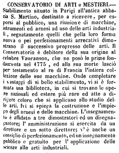 | Conservatorio di arti e mestieri - Stabilimento situato in Parigi all'antica abbazia S. Martino, destinato a ricevere, per esporsi al pubblico, una riunione di macchine, istrumenti ed arnesi ad uso delle arti industriali, segnatamente quelli che pella loro forma nuova o pei perfezionamenti arrecativi dimostrano il successivo progresso delle arti. Il Conservatorio è debitore della sua origine al celebre Vaucanson, che ne posò le prime fondamenta nel 1775, ed alla sua morte lasciò per testamento al re di Francia l'intiera collezione delle sue macchine. Onde completare i vantaggi di si bello stabilimento, vi si è formata una biblioteca, in cui si trovano le opere nazionali ed estere più rare ed atte a dirigere coloro che si applicano allo studio delle arti. Ivi si spiega la costruzione e l'impiego degli arnesi e delle macchine. L'insegnamento è affidato a tre dimostratori ed un disegnatore; l'amministrazione si esercita da un direttore e un sotto direttore; v'è anche un consiglio di perfezionamento, ed un insegnamento pubblico e gratuito per l'applicazione delle scienze alle arti industriali. [immagine] |