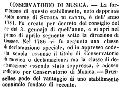 | Conservatorio di musica - La formazione di questo stabilimento, noto dapprima sotto nome di Scuola di canto, è dell'anno 1784. Fu creato per decreto del consiglio del re del 3. gennajo di quell'anno, e si aprì nel primo di aprile seguente sotto la direzione di Gossec. Nel 1786 vi fu aggiunta una classe di declamazione speciale, ed in appresso codesta scuola assunse il titolo di Conservatorio di musica e declamazione; ma la classe di declamazione essendo stata soppressa, è adesso indicato per Conservatorio di Musica. - Brusselles gode del vantaggio di uno stabilimento consimile fondato di recente. [immagine] |