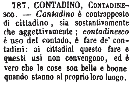 | Contadino, Contadinesco - Contadino è contrapposto di cittadino, sia sostantivamente che aggettivamente; contadinesco è uso del contado, è fare de' contadini: ai cittadini questo fare e questi usi non convengono, ed è vero che le cose son belle e buone quando stanno al proprio loro luogo. [immagine] |