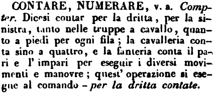 | Contare, Numerare - v. a. Compter. Dicesi contar per la dritta, per la sinistra, tanto nelle truppe a cavallo, quanto a piedi per ogni fila; la cavalleria conta sino a quattro, e la fanteria conta il pari e l'impari per eseguir i diversi movimenti e manovre; quest'operazione si esegue al comando - per la dritta contate. [immagine] |