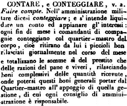 | Contare, e Conteggiare - v. a. Faire compte. Nell'amministrazione militare dicesi conteggiare; e s'intende liquidare un conto ed appianare gl'interessi: ogni fin di mese i comandanti di compagnie conteggiano col quartier-mastro del corpo, cioè ritirano da lui i piccioli bon rilasciati giornalmente nel corso del mese e totalizzano le somme sì del prestito che delle razioni del pane e viveri, rilasciando boni complessivi delle quantità ricevute, onde potersi questi boni generali portar dal Quartier-mastro all'appoggio di quella gestione, di cui ogni consiglio di amministrazione è responsabile. [immagine] |