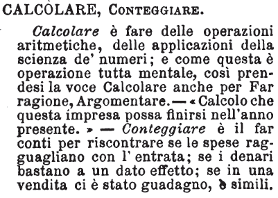 | Calcolare, Conteggiare - Calcolare è fare delle operazioni aritmetiche, delle applicazioni della scienza de' numeri; e come questa è operazione tutta mentale, così prendesi la voce Calcolare anche per Far ragione, Argomentare. - «Calcolo che questa impresa possa finirsi nell'anno presente.» - Conteggiare è il far conti per riscontrare se le spese ragguagliano con l'entrata; se i denari bastano a un dato effetto; se in una vendita ci è stato guadagno, e simili. [immagine] |