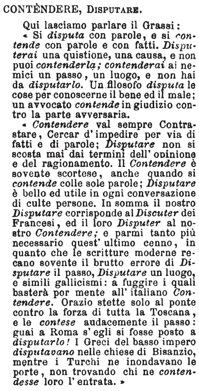 « Si disputa con parole, e si contende con parole e con fatti. Disputerai una quistione, una causa, e non puoi contenderla; contenderai ai nemici un passo, un luogo, e non hai da disputarlo. Un filosofo disputa le cose per conoscerne il bene ed il male; un avvocato contende in giudizio contro la parte avversaria. « Contendere val sempre Contrastare, Cercar d'impedire per via di fatti e di parole; Disputare non si scosta mai dai termini dell'opinione e del ragionamento. Il Contendere è sovente scortese, anche quando si contende colle sole parole; Disputare è bello ed utile in ogni conversazione di culte persone. In somma il nostro Disputare corrisponde al Discuter dei Francesi, ed il loro Disputer al nostro Contendere; e parmi tanto più necessario quest'ultimo cenno, in quanto che le scritture moderne recano sovente il brutto errore di Disputare il passo, Disputare un luogo, e simili gallicismi: a fuggire i quali basterà por mente all'italiano Contendere. Orazio stette solo al ponte contro la forza di tutta la Toscana, e le contese audacemente il passo: guai a Roma s'egli si fosse posto a disputarlo! I Greci del basso impero disputavano nelle chiese di Bisanzio, mentre i Turchi ne inondavano le porte, non trovando chi ne contendesse loro l'entrata.» [immagine] |