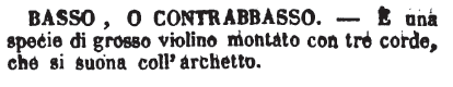 | Basso o Contrabbasso - E' una specie di grosso violino montato con tre corde, che si suona coll'archetto. [immagine] |