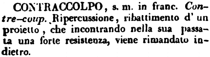 | Contraccolpo - s. m. in franc. Contre-coup. Ripercussione, ribattimento d'un proietto, che incontrando nella sua passata una forte resistenza, viene rimandato indietro. [immagine] |