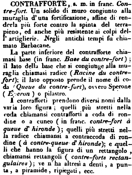 | Contrafforte - s. m. in franc. Contre-fort. Un solido di muro congiunto alla muraglia d'una fortificazione, affine di renderla più forte contro la spinta del terrapieno, ed anche più resistente ai colpi dell'artiglieria. Negli antichi tempi fu chiamato Barbacane.