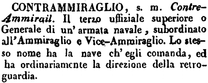 | Contrammiraglio - s. m. Contre-Ammirail. Il terzo uffiziale superiore o Generale di un'armata navale, subordinato all'Ammiraglio e Vice-Ammiraglio. Lo stesso nome ha la nave ch'egli comanda, ed ha ordinariamente la direzione della retroguardia. [immagine] |