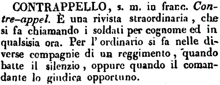 | Contrappello - s. m. in franc. Contre-appel. È una rivista straordinaria, che si fa chiamando i soldati per cognome ed in qualsisia ora. Per l'ordinario si fa nelle diverse compagnie di un reggimento, quando batte il silenzio, oppure quando il comandante lo giudica opportuno. [immagine] |