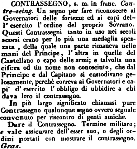 | Contrassegno - s. m. in franc. Contre-seing. Un segno per fare riconoscere ai Governatori delle fortezze ed ai capi dell'esercito l'ordine del proprio Sovrano. Questi Contrassegni tanto in uso nei secoli scorsi erano per lo più una medaglia spezzata, della quale una parte rimaneva nelle mani del Principe, l'altra in quelle del Castellano o capo delle armi; e talvolta una cifera od un nome non conosciuto, che dal Principe e dal Capitano si custodivano gelosamente, perchè correva ai Governatori e capi d'esercito l'obbligo di ubbidire a chi dava loro il contrassegno.