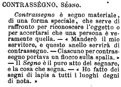 | Contrassegno, Segno, Indizio - «Il contrassegno è segno pattuito: ha per iscopo il riconoscere persona o cosa, il rammentare, l'avvisare. Segno, come ognun vede, è voce generalissima». A.