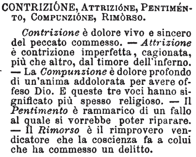 | Contrizione, Attrizione, Pentimento, Compunzione, Rimorso - Contrizione è dolore vivo e sincero del peccato commesso. - Attrizione è contrizione imperfetta, cagionata, più che altro, dal timore dell'inferno. - La Compunzione è dolore profondo di un'anima addolorata per avere offeso Dio. E queste tre voci hanno significato più spesso religioso, - Il Pentimento è rammarico di un fallo al quale si vorrebbe poter riparare. - Il Rimorso è il rimprovero vendicatore che la coscienza fa a colui che ha commesso un delitto. [immagine] |