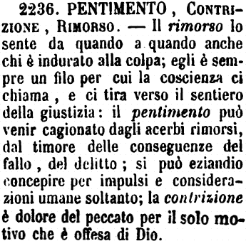 | Pentimento, Contrizione, Rimorso - Il rimorso lo sente da quando a quando anche chi è indurato alla colpa; egli è sempre un filo per cui la coscienza ci chiama, e ci tira verso il sentiero della giustizia: il pentimento può venir cagionato dagli acerbi rimorsi, dal timore delle conseguenze del fallo, del delitto; si può eziandio concepire per impulsi e considerazioni umane soltanto; la contrizione è dolore del peccato per il solo motivo che è offesa di Dio. [immagine] |