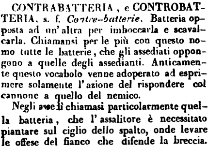| Contrabatteria, e Controbatteria - s. f. Contre-batterie. Batteria opposta ad un'altra per imboccarla e scavalcarla. Chiamansi per le più con questo nome tutte le batterie, che gli assediati oppongono a quelle degli assedianti. Anticamente questo vocabolo venne adoperato ad esprimere solamente l'azione del rispondere col cannone a quello del nemico.