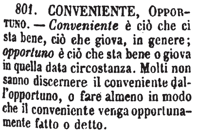 | Conveniente, Opportuno - Conveniente è ciò che ci sta bene, ciò che giova, in genere; opportuno è ciò che sta bene o giova in quella data circostanza. Molti non sanno discernere il conveniente dall'opportuno, o fare almeno in modo che il conveniente venga opportunamente fatto o detto. [immagine] |