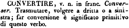 | Convertire - v. n. in franc. Converser. Trasmutare, volgere a dritta o a sinistra; far conversione è significato primitivo di questo verbo. [immagine] |
