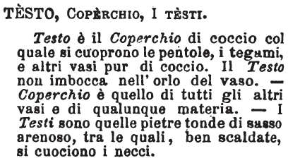 | Testo, Coperchio, I testi - Testo è il Coperchio di coccio col quale si cuoprono le pentole, i tegami, e altri vasi pur di coccio. Il Testo non imbocca nell'orlo del vaso. - Coperchio è quello di tutti gli altri vasi e di qualunque materia. - I Testi sono quelle pietre tonde di sasso arenoso, tra le quali, ben scaldate, si cuociono i necci. [immagine] |