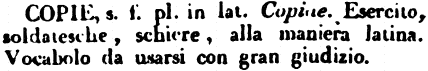 | Scartando le parti in comune (prima in capo e poi in coda), "copie" si può ottenere dalle seguenti coppie: dico/piedi, ridico/pieridi, roco/piero, taco/pietà, tristico/pietristi, troco/pietro, vico/pievi. |