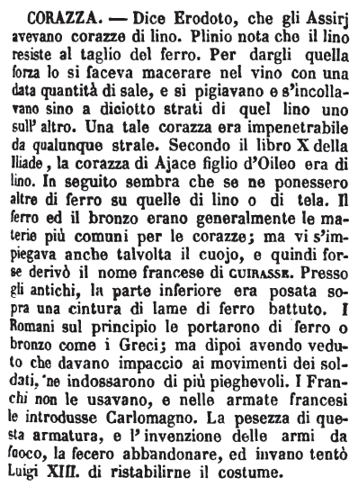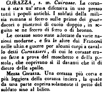 Corazza - Arme difensiva, che gli antichi inventarono per guarentirsi dalle ferite nei combattimenti. Ve n'erano d'un metallo così duro da essere assolutamente impenetrabili rispetto ai colpi, ed ai dardi ancora lanciati con Catapulte. Si fecero da principio certe Corazze di ferro, o di rame divise in due parti, che si attaccavano con opportune fibbie sui lati. Alessandro non lasciò alla Corazza, se non se la parte, che copriva il petto, a motivo che il timore d'esser ferito nelle spalle, le quali erano senza difesa, impedisse ai soldati il fuggire.