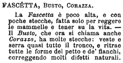 Fascetta, Busto, Corazza - La Fascetta è poco alta, e con poche stecche, fatta solo per reggere le mammelle e tener su la vita. - Il Busto, che ora si chiama anche Corazza, ha molte stecche: veste e serra quasi tutto il tronco, e ritrae tutte le forme del petto e de' fianchi, correggendo molti difetti naturali. [immagine]