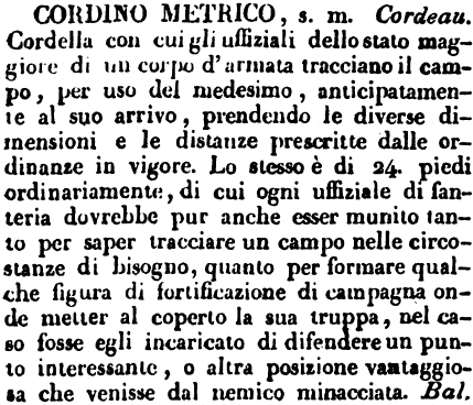 | Cordino metrico - s. m. Cordeau. Cordella con cui gli uffiziali dello stato maggiore di un corpo d'armata tracciano il campo, per uso del medesimo, anticipatamente al suo arrivo, prendendo le diverse dimensioni e le distanze prescritte dalle ordinanze in vigore. Lo stesso è di 24. piedi ordinariamente, di cui ogni uffiziale di fanteria dovrebbe pur anche esser munito tanto per saper tracciare un campo nelle circostanze di bisogno, quanto per formare qualche figura di fortificazione di campagna onde metter al coperto la sua truppa, nel caso fosse egli incaricato di difendere un punto interessante, o altra posizione vantaggiosa che venisse dal nemico minacciata. Bal. [immagine] |