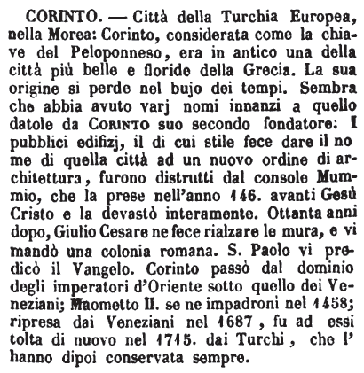 | Corinto - Città della Turchia Europea, nella Morea: Corinto, considerata come la chiave del Peloponneso, era in antico una della città più belle e floride della Grecia. La sua origine si perde nel bujo dei tempi. Sembra che abbia avuto varj nomi innanzi a quello datole da Corinto suo secondo fondatore: I pubblici edifizj, il di cui stile fece dare il nome di quella città ad un nuovo ordine di architettura, furono distrutti dal console Mummio, che la prese nell'anno 146. avanti Gesù Cristo e la devastò interamente. Ottanta anni dopo, Giulio Cesare ne fece rialzare le mura, e vi mandò una colonia romana. S.Paolo vi predicò il Vangelo. Corinto passò dal dominio degli imperatori d'Oriente sotto quello dei Veneziani; Maometto II. se ne impadronì nel 1458; ripresa dai Veneziani nel 1687, fu ad essi tolta di nuovo nel 1715. dai Turchi, che l'hanno dipoi conservata sempre. [immagine] |