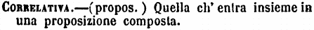 | Correlativa - (propos.) Quella ch'entra insieme in una proposizione composta. [immagine] |