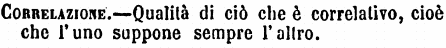 | Correlazione - Qualità di ciò che è correlativo, cioè che l'uno suppone sempre l'altro. [immagine] |