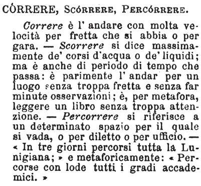 | Correre, Scorrere, Percorrere - Correre è l'andare con molta velocità per fretta che si abbia o per gara. - Scorrere si dice massimamente de' corsi d'acqua o de' liquidi; ma è anche di periodo di tempo che passa: è parimente l'andar per un luogo senza troppa fretta e senza far minute osservazioni; è, per metafora, leggere un libro senza troppa attenzione. - Percorrere si riferisce a un determinato spazio per il quale si vada, o per diletto o per ufficio. - «In tre giorni percorsi tutta la Lunigiana;» e metaforicamente: «Percorse con lode tutti i gradi accademici.» [immagine] |