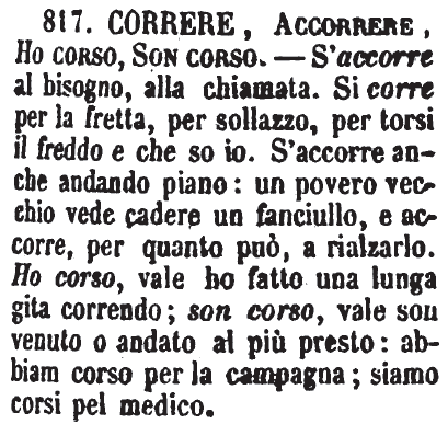 | Correre, Accorrere, Ho corso, Son corso - S'accorre al bisogno, alla chiamata. Si corre per la fretta, per sollazzo, per torsi il freddo e che so io. S'accorre anche andando piano: un povero vecchio vede cadere un fanciullo, e accorre, per quanto può, a rialzarlo. Ho corso, vale ho fatto una lunga gita correndo; son corso, vale son venuto o andato al più presto: abbiam corso per la campagna; siamo corsi pel medico. [immagine] |