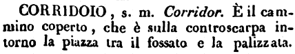 | Corridoio - s. m. Corridor. È il cammino coperto, che è sulla controscarpa intorno la piazza tra il fossato e la palizzata. [immagine] |
