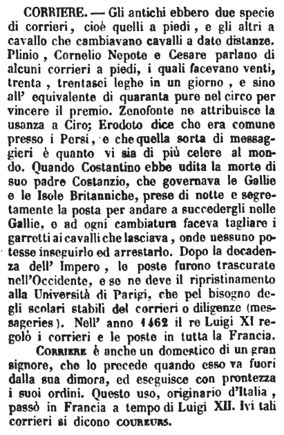 Corriere - Gli antichi ebbero due specie di corrieri, cioè quelli a piedi, e gli altri a cavallo che cambiavano cavalli a date distanze. Plinio, Cornelio Nepote e Cesare parlano di alcuni corrieri a piedi, i quali facevano venti, trenta, trentasei leghe in un giorno, e sino all'equivalente di quaranta pure nel circo per vincere il premio. Zenofonte ne attribuisce la usanza a Ciro; Erodoto dice che era comune presso i Persi, e che quella sorta di messaggieri è quanto vi sia di più celere al mondo. Quando Costantino ebbe udita la morte di suo padre Costanzio, che governava le Gallie e le Isole Britanniche, prese di notte e segretamente la posta per andare a succedergli nelle Gallie, e ad ogni cambiatura faceva tagliare i garretti ai cavalli che lasciava, onde nessuno potesse inseguirlo ed arrestarlo. Dopo la decadenza dell'Impero, le poste furono trascurate nell'Occidente, e se ne deve il ripristinamento alla Università di Parigi, che pel bisogno degli scolari stabilì del corrieri o diligenze (messageries). Nell'anno 1462 il re Luigi XI regolò i corrieri e le poste in tutta la Francia.