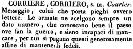 | Corriere, Corriero - s. m. Courier. Messaggio, colui che porta pieghi ovvero lettere. Le armate ne scelgono sempre un dato numero, che conoscano bene il paese ove fan la guerra, e sieno incapaci di mancare, per cui si pagano questi generosamente affine di mantenerli fedeli. [immagine] |