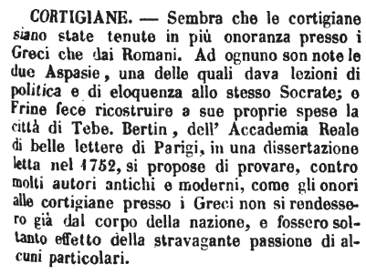 | Cortigiane - Sembra che le cortigiane siano state tenute in più onoranza presso i Greci che dai Romani. Ad ognuno son note le due Aspasie, una delle quali dava lezioni di politica e di eloquenza allo stesso Socrate; e Frine fece ricostruire a sue proprie spese la città di Tebe. Bertin, dell'Accademia Reale di belle lettere di Parigi, in una dissertazione letta nel 1752, si propose di provare, contro molti autori antichi e moderni, come gli onori alle cortigiane presso i Greci non si rendessero già dal corpo della nazione, e fossero soltanto effetto della stravagante passione di alcuni particolari. [immagine] |