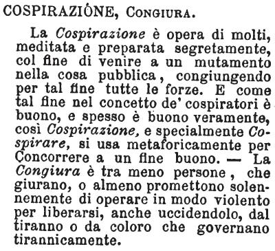 | Cospirazione - [T.] S. f. Azione del cospirare e patti ed effetti di quella. Aureo lat.