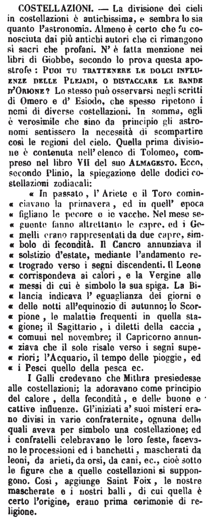 «In passato, l’Ariete e il Toro cominciavano la primavera, ed in quell’epoca figliano le pecore e le vacche. Nel mese seguente fanno altrettanto le capre, ed i Gemelli erano rappresentati da due capre, simbolo di fecondità. Il Cancro annunziava il solstizio d’estate, mediante l’andamento retrogrado verso i segni discendenti. Il Leone corrispondeva ai calori, e la Vergine alle messi di cui è simbolo la sua spiga. La Bilancia indicava l’eguaglianza dei giorni e delle notti all’equinozio di autunno; lo Scorpione, le malattie frequenti in quella stagione; il Sagittario, i diletti della caccia, comuni nel novembre; il Capricorno annunziava che il sole risale verso i segni superiori; l’Acquario, il tempo delle pioggie, ed i Pesci quello della pesca ec.» I Galli credevano che Mithra presiedesse alle costellazioni; la adoravano come principio del calore, della fecondità, e delle buone e cattive influenze. Gl’iniziati a’ suoi misteri erano divisi in varie confraternite, ognuna delle quali aveva per simbolo una costellazione; ed i confratelli celebravano le loro feste, facevano le processioni ed i banchetti, mascherati da leoni, da arieti, da orsi, da cani, ec., cioè sotto le figure che a quelle costellazioni si suppongono. Così, aggiunge Saint Foix, le nostre mascherate e i nostri balli, di cui quella è certo l’origine, erano prima cerimonie di religione. [immagine] |